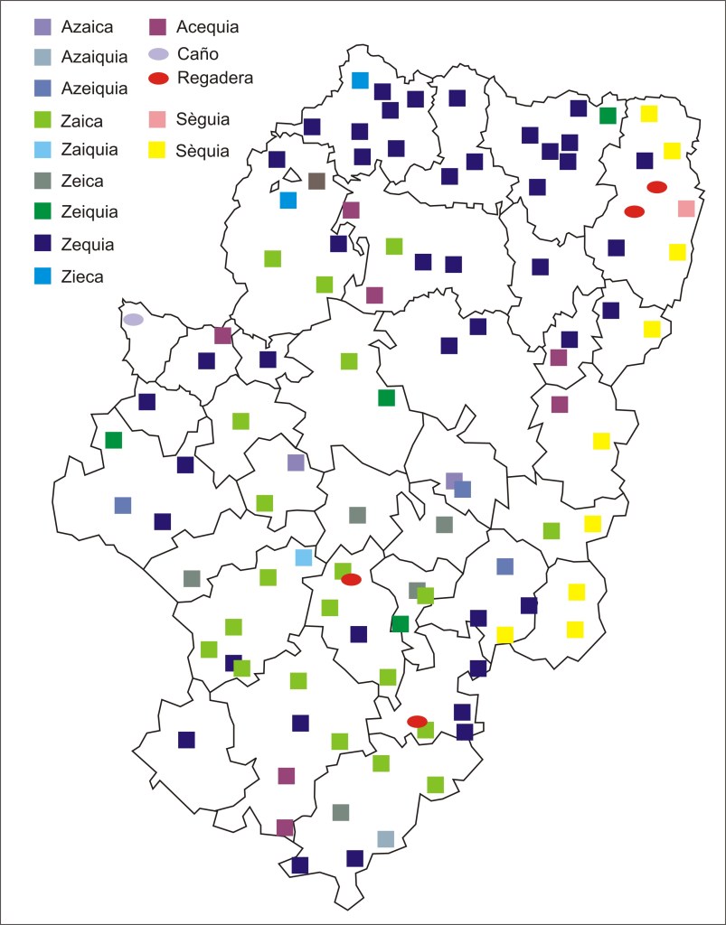 Aparte de unos pocos ejemplos ajenos a la raíz común (caño y regadera), se aprecian bien las diferentes variedades aragonesas (azaica, azaiquia, azeiquia, zaica, zaiquia, zeica, zeiquia, zequia y zieca) distribuidas por casi todo el territorio (aunque se aprecia cierta preponderancia de zequia en el Alto Aragón y de zaica en el resto) así como las dos variantes propias del catalán (sèguia y sèquia) en la franja oriental de Aragón en la que el catalán es lengua propia y popular.